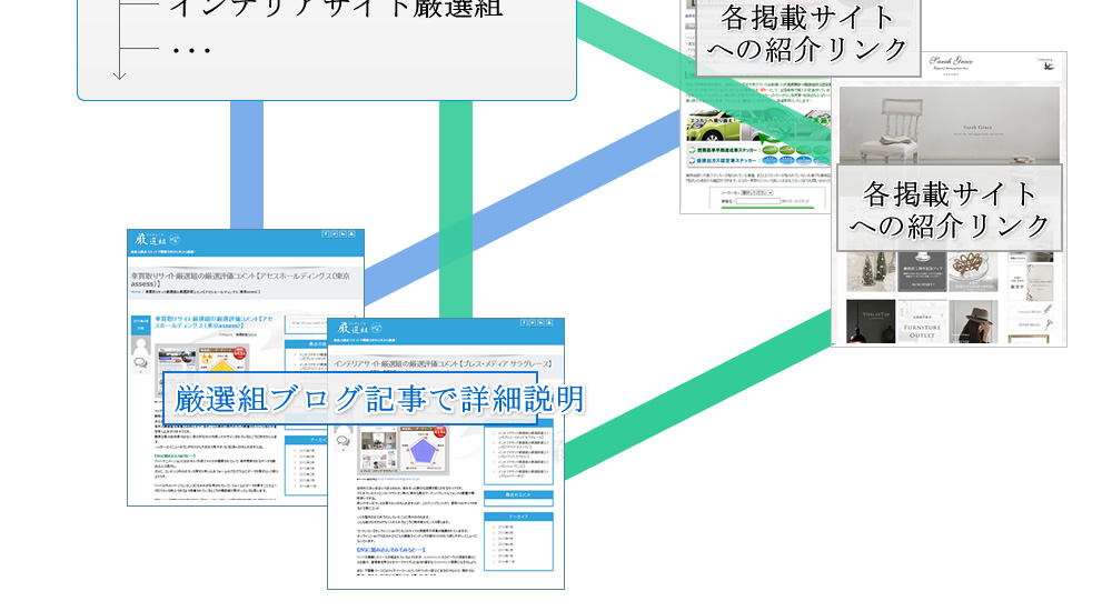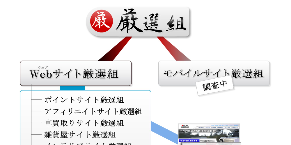 トップカテゴリのWebサイト厳選組に連なり、それぞれのサイト厳選組が掲載されています。各厳選組の基準に沿ってサイトを厳選し評価していますので、注目するポイントも厳選組によって異なる場合があります。また、各厳選組のランキングには評価コメントが添えられ、さらに厳選組ブログ記事でその詳細を確認することができます。