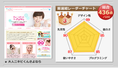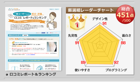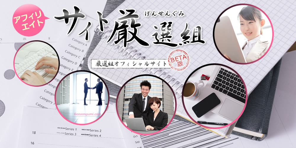 アフィリエイトサイト厳選組の審査基準は、アフィリエイトであることをユーザーに感じさせないシステムやレイアウトに重点を置き、さらにユーザーを引き付ける魅力を持つサイトを総合的に審査し評価コメントを添えています。